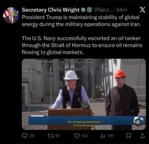 - Tuesday ~11:30 AM EST: “US Navy has escorted an oil tanker through Strait of Hormuz, US energy secretary says“