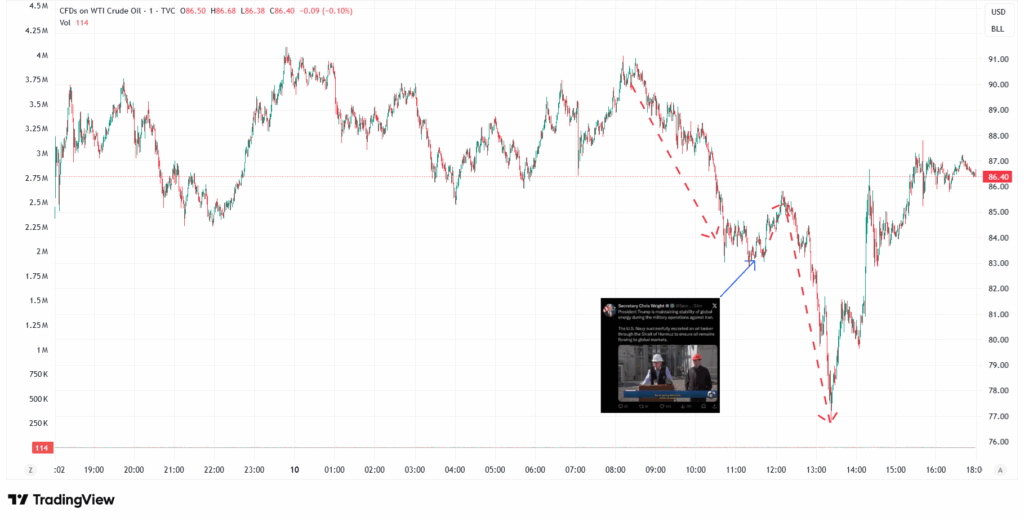 In other words, it’s hard not to believe insiders were in a position to front-run that announcement, considering how the price rallied in the minutes following the post as a sign short positions were being closed for a profit. However, what insiders clearly did not expect was for the market to believe that claim. As a consequence, as soon as trading algorithms started to pick up mainstream media “breaking news” spreading the false claim, they started dumping US crude oil futures aggressively. Objectively speaking, the claim in Wright’s post was so blatantly fake to anyone with a bare minimum knowledge of the current situation in the Middle East, but news agencies and mainstream media did not bother to apply any filter and rushed to publish the fake news, nevertheless.