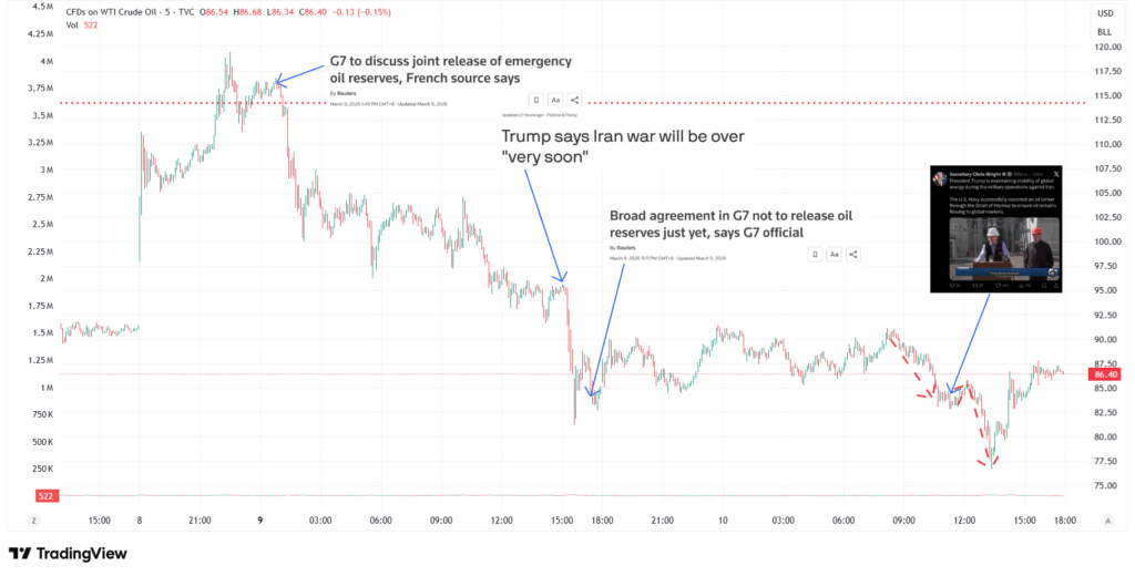 Are the US and its allies coordinating just to manage the narrative with the intent of calming nervous traders, or is there more behind these events, perhaps even an active participation of the governments in the crude oil futures markets to significantly move the oil price lower, strengthening the impression of a market endorsement of their claims? Unfortunately, this is difficult to prove, but the suspicion is strong considering many similar precedents like the Biden administration actively using the release of SPR to force the price of crude oil lower: “Biden’s use of oil reserves overshadows past presidents.” Hilariously, this was a move that Trump himself openly criticized because it would have put the US economy in a very weak spot in case of war, especially in the Middle East.